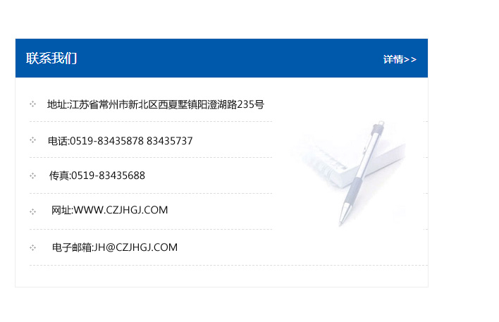 傳真:0519-83435688    郵編:213135    網址:WWW.czjhgj_com.xztkd.com    電子郵箱:JH@czjhgj_com.xztkd.com
